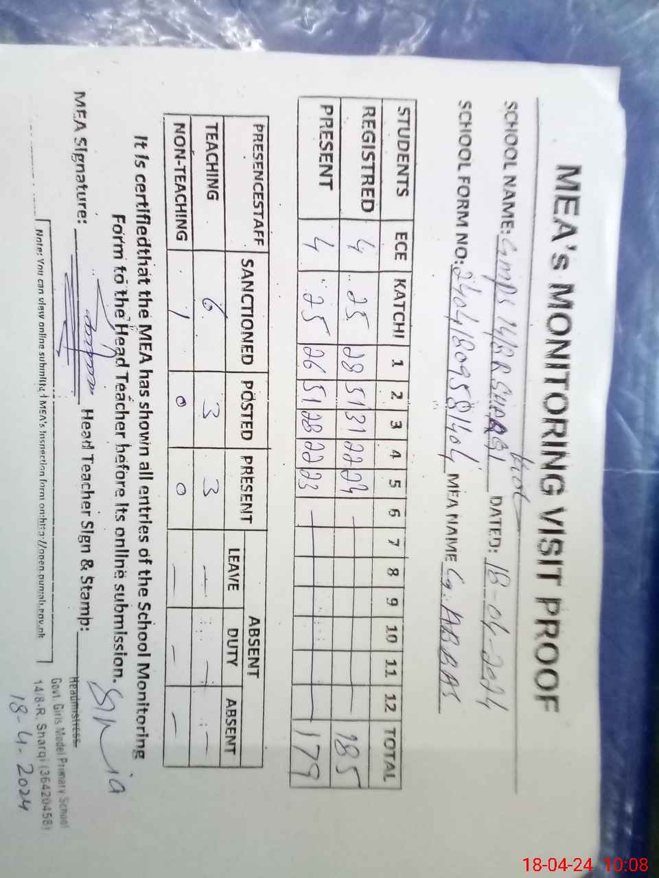 | Attendance Register | Head Teacher | MEA with School | Visit Proof |