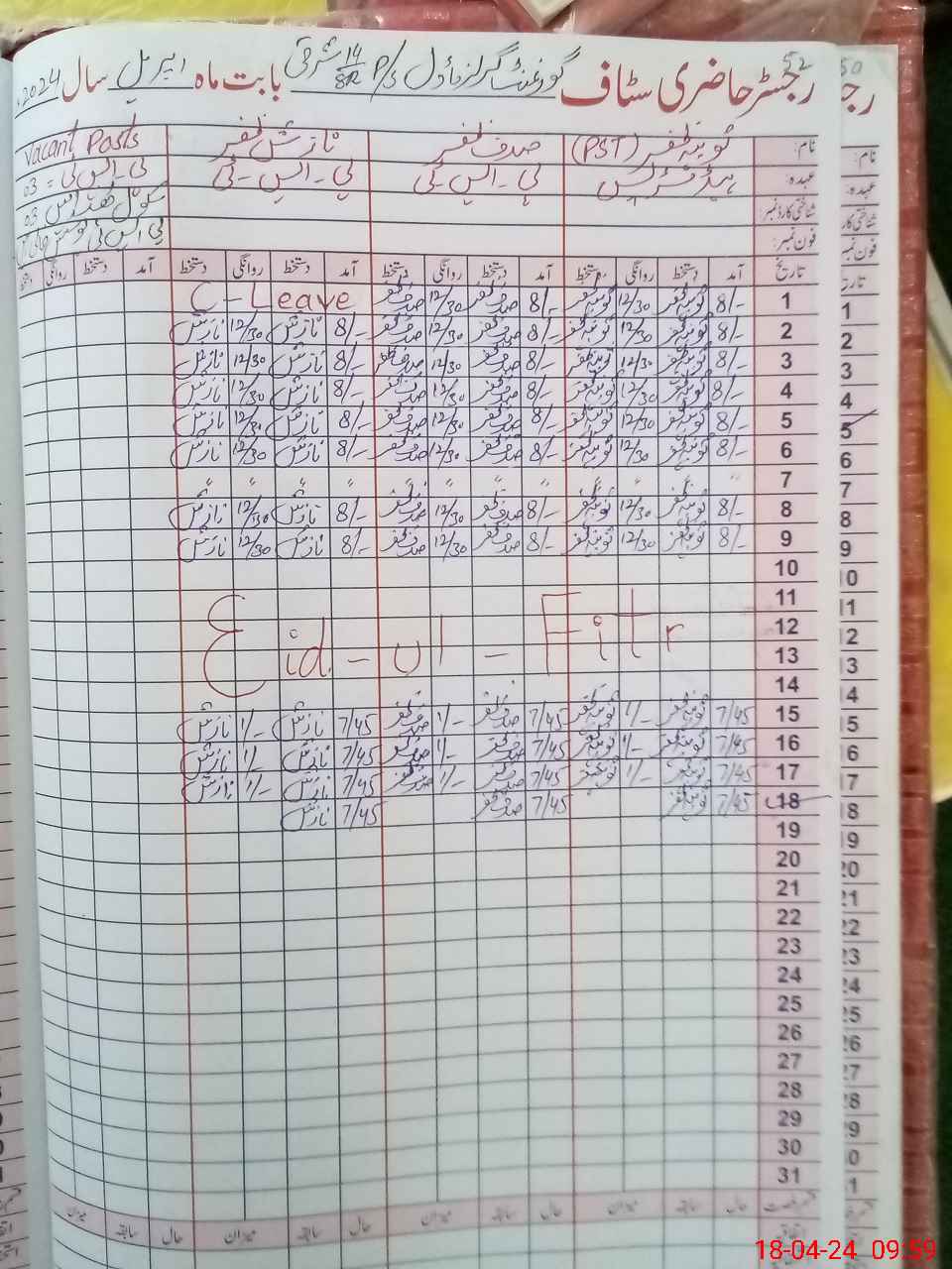 | CNIC | Full Name | Designation | R/C | Absence During Last Calender Month |