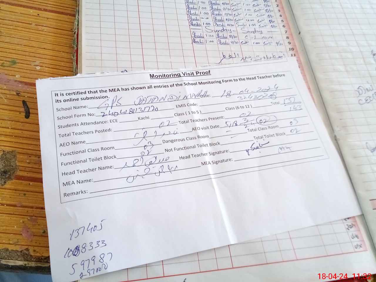 | Attendance Register | Head Teacher | MEA with School | Visit Proof |