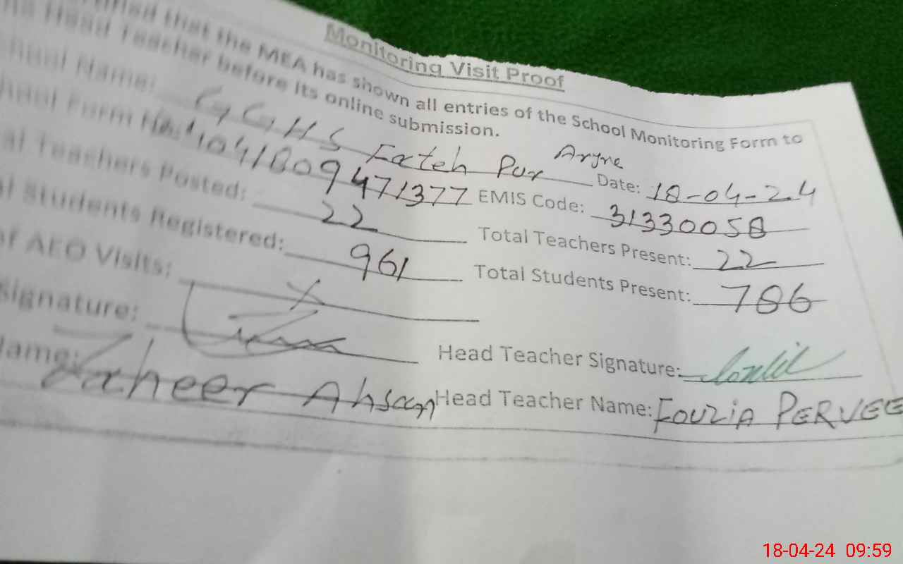 | EMIS Code: 31330058 | Name of School: GGHS FATEH PUR ARAIN | |||