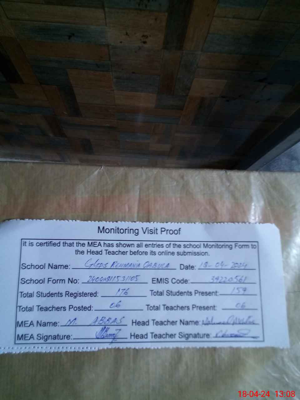 | Attendance Register | Head Teacher | MEA with School | Visit Proof |
