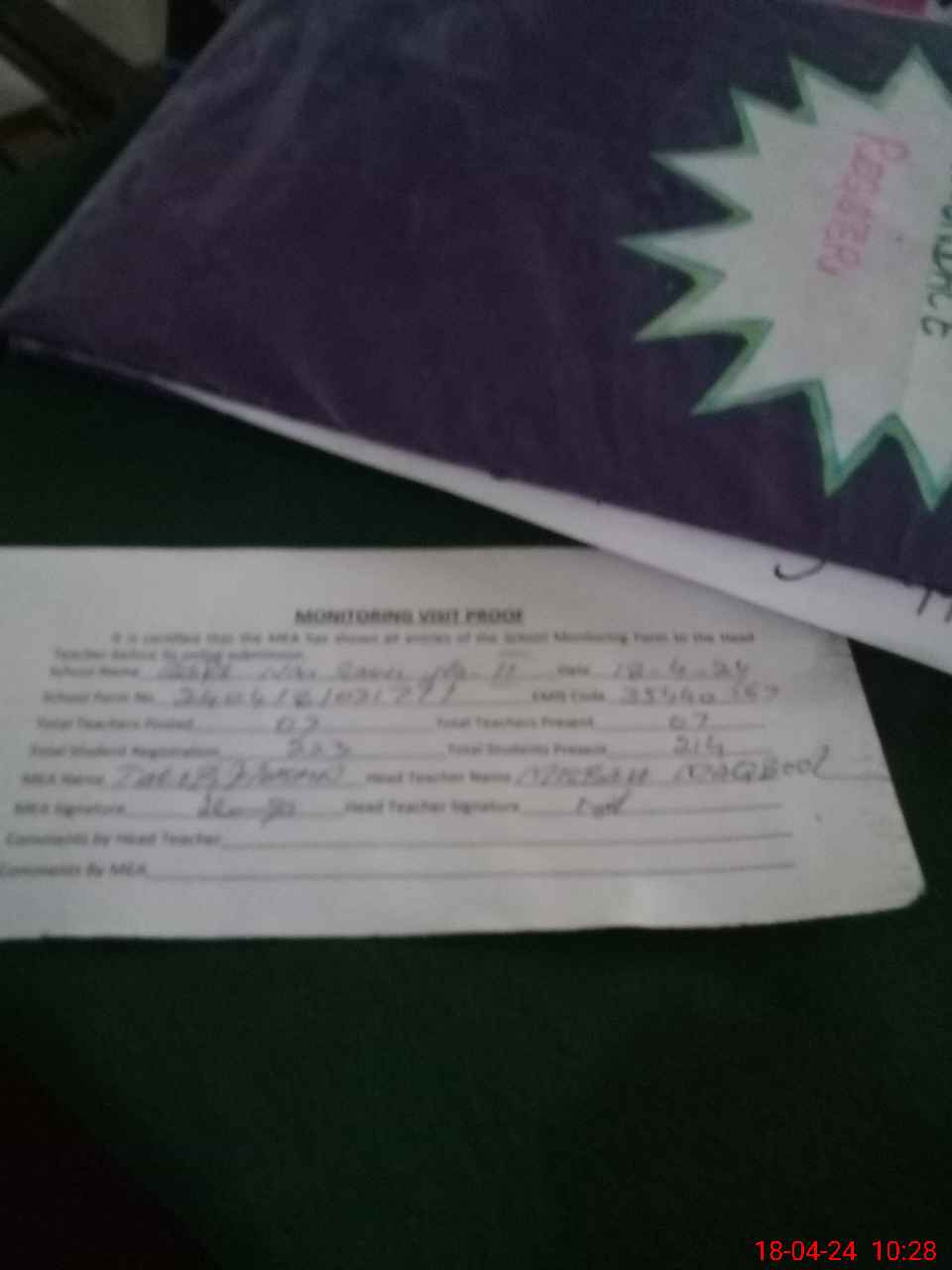 | Attendance Register | Head Teacher | MEA with School | Visit Proof |