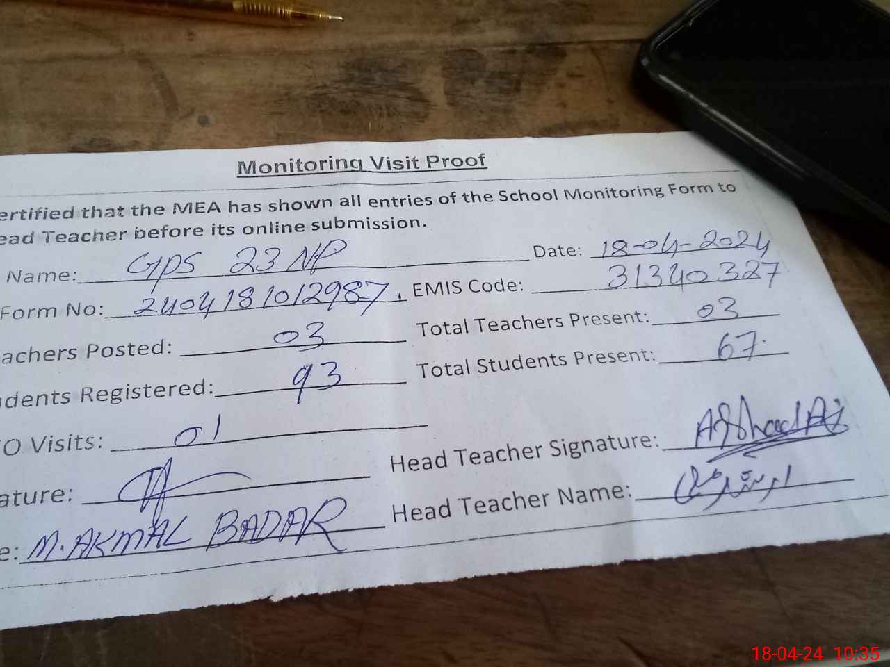 | Attendance Register | Head Teacher | MEA with School | Visit Proof |