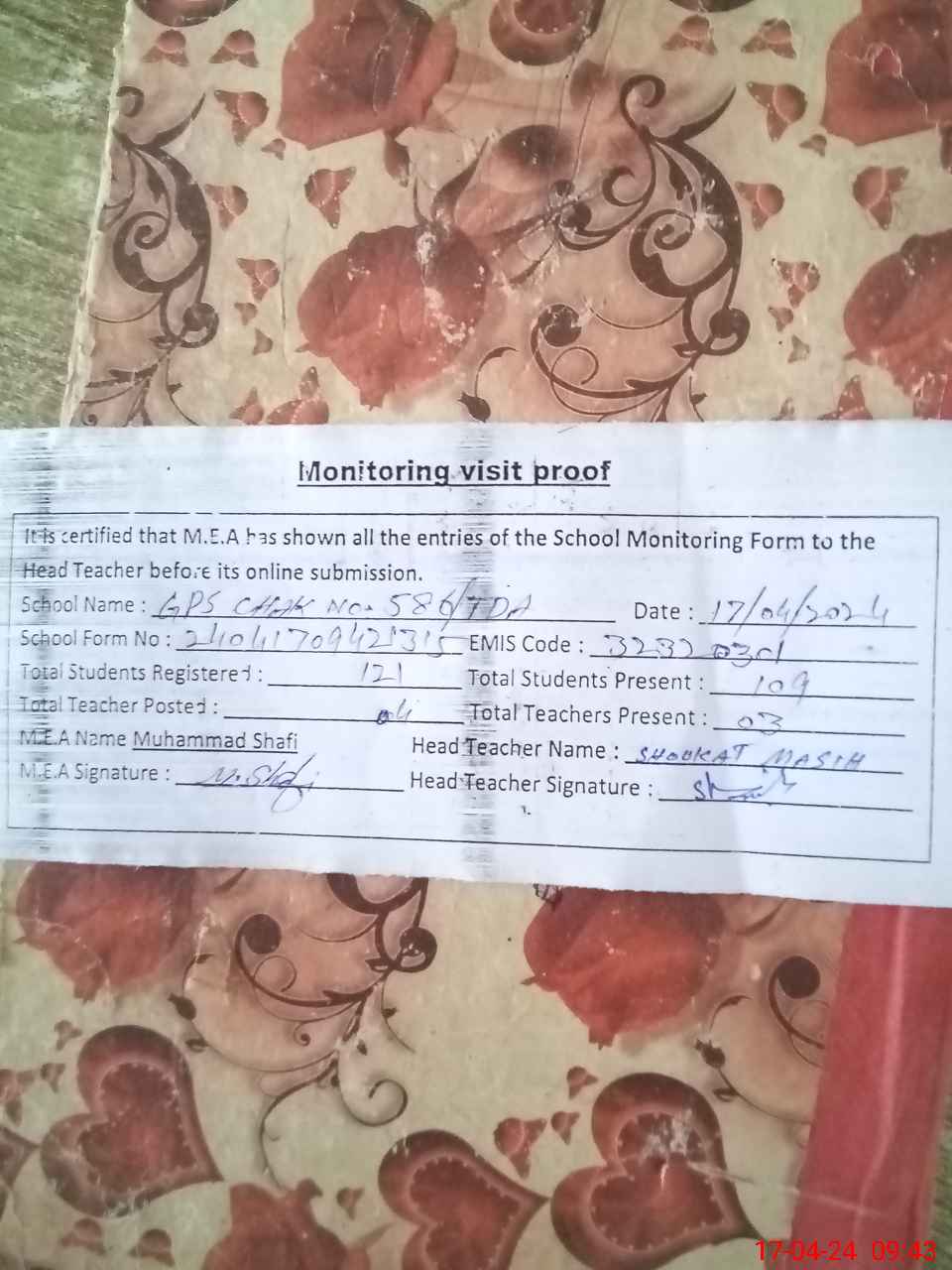 | EMIS Code: 32320301 | Name of School: GPS CHAK NO.586 TDA | |||