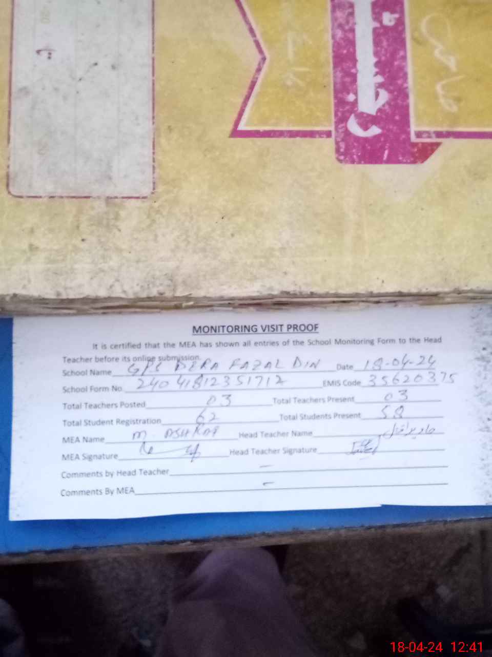 | EMIS Code: 35620375 | Name of School: GPS DERA FAZAL DIN | |||