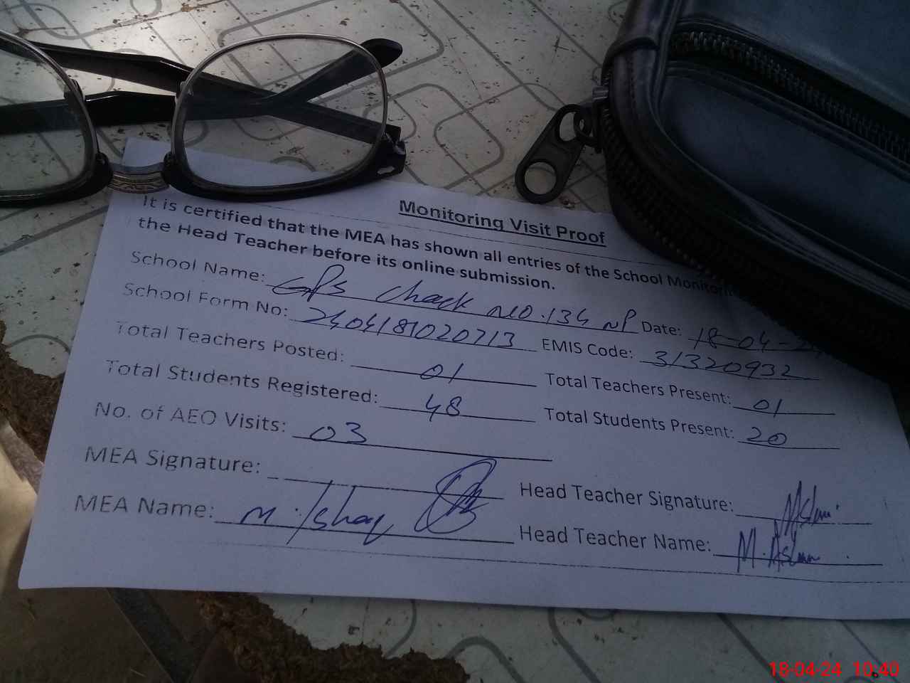 | Attendance Register | Head Teacher | MEA with School | Visit Proof |