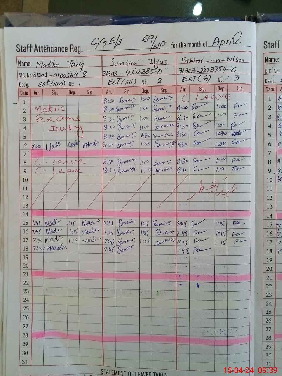 | CNIC | Full Name | Designation | R/C | Absence During Last Calender Month |