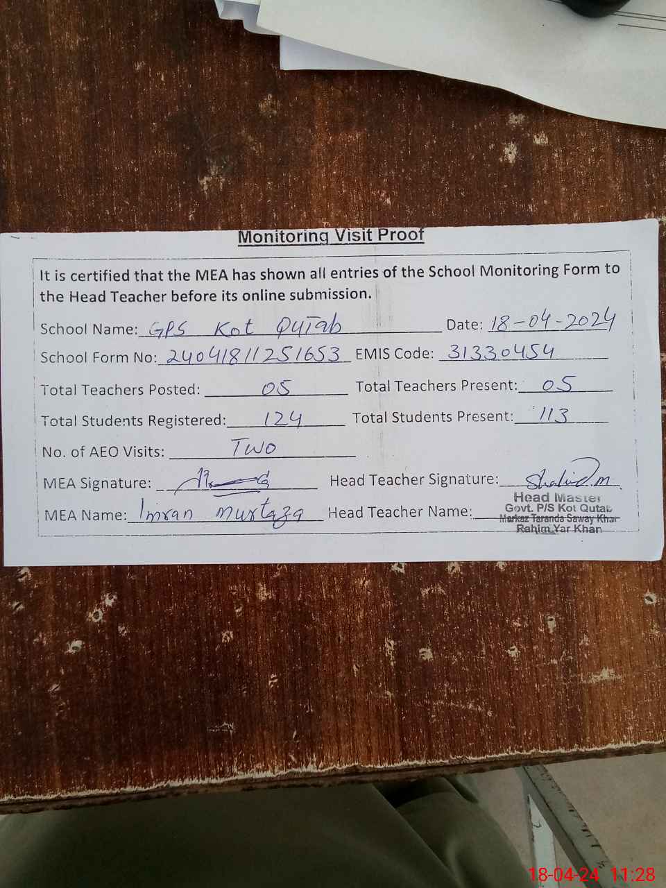 | EMIS Code: 31330454 | Name of School: GPS KOT QUATAB | |||