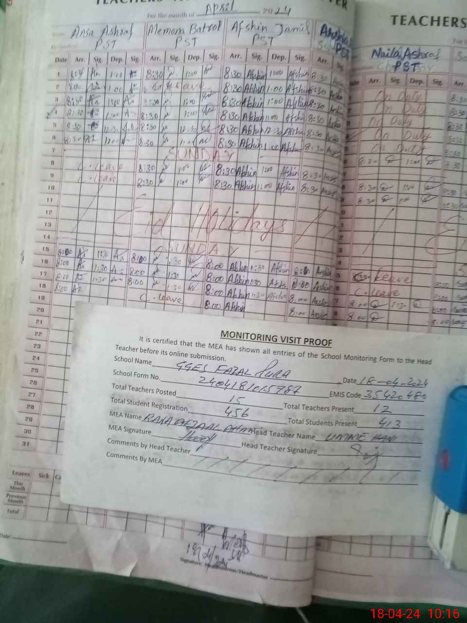 | Attendance Register | Head Teacher | MEA with School | Visit Proof |