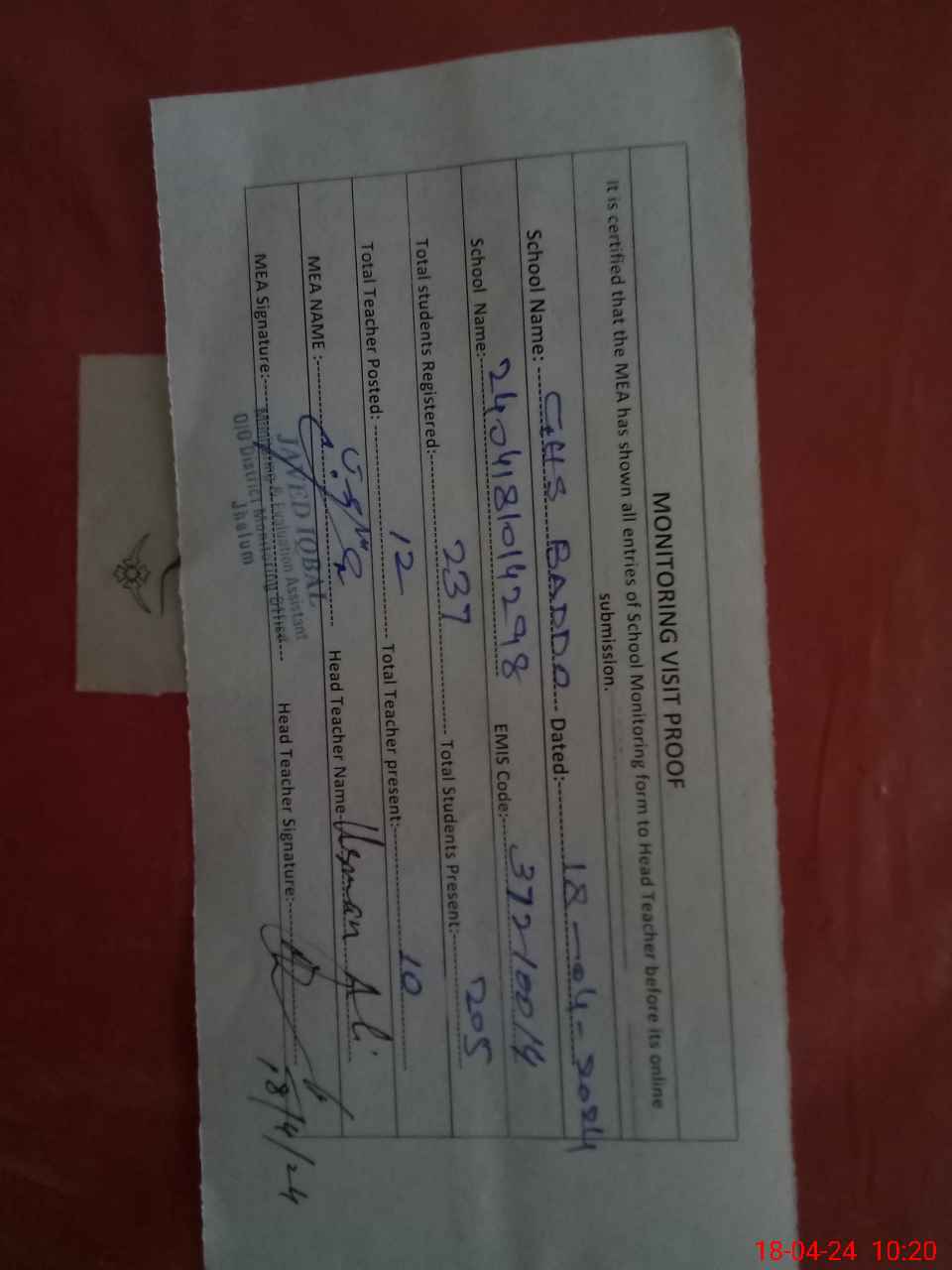 | Certified that this School was Inspected by the Undersigned MEA/DMO Today and the Information Stated Above is as Per Record. | |||||