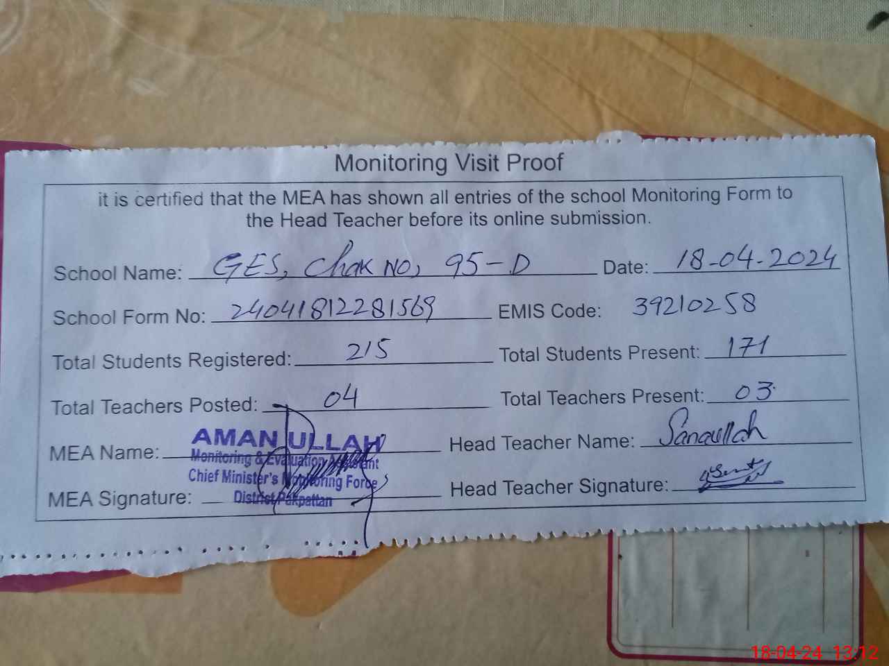 | EMIS Code: 39210258 | Name of School: GES CHAK NO. 95 /D | |||