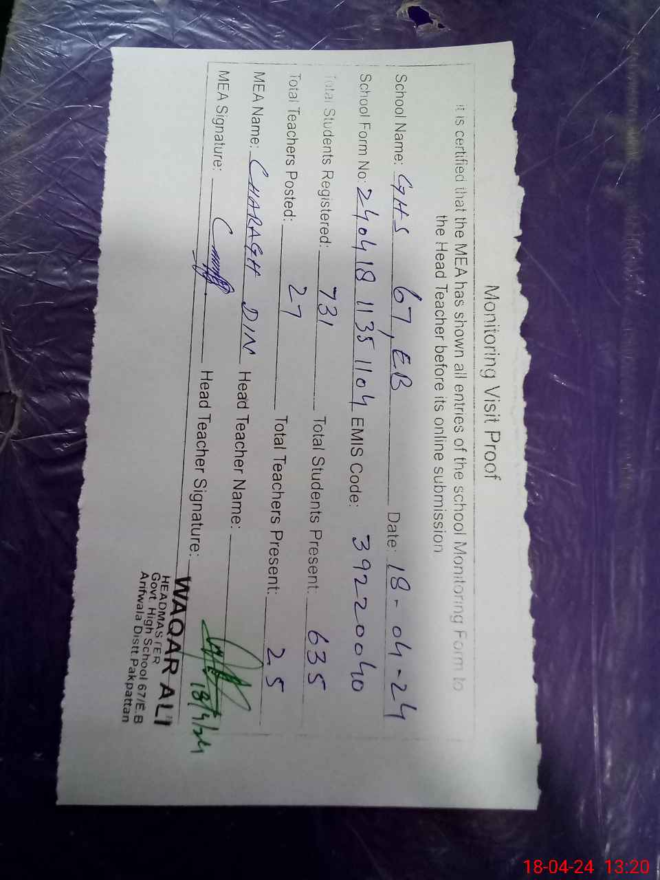 | EMIS Code: 39220040 | Name of School: GHS 67 EB | |||