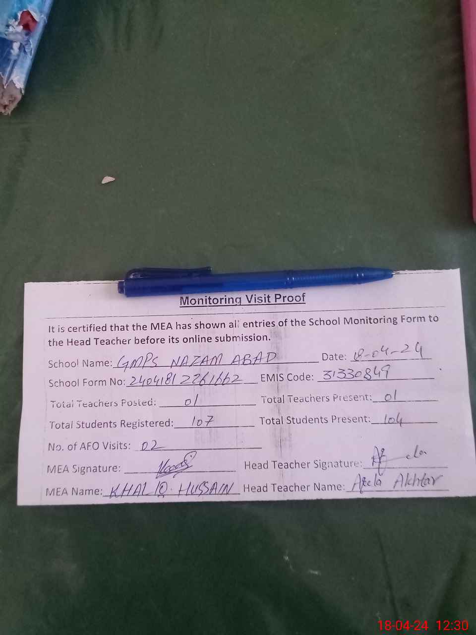 | Attendance Register | Head Teacher | MEA with School | Visit Proof |
