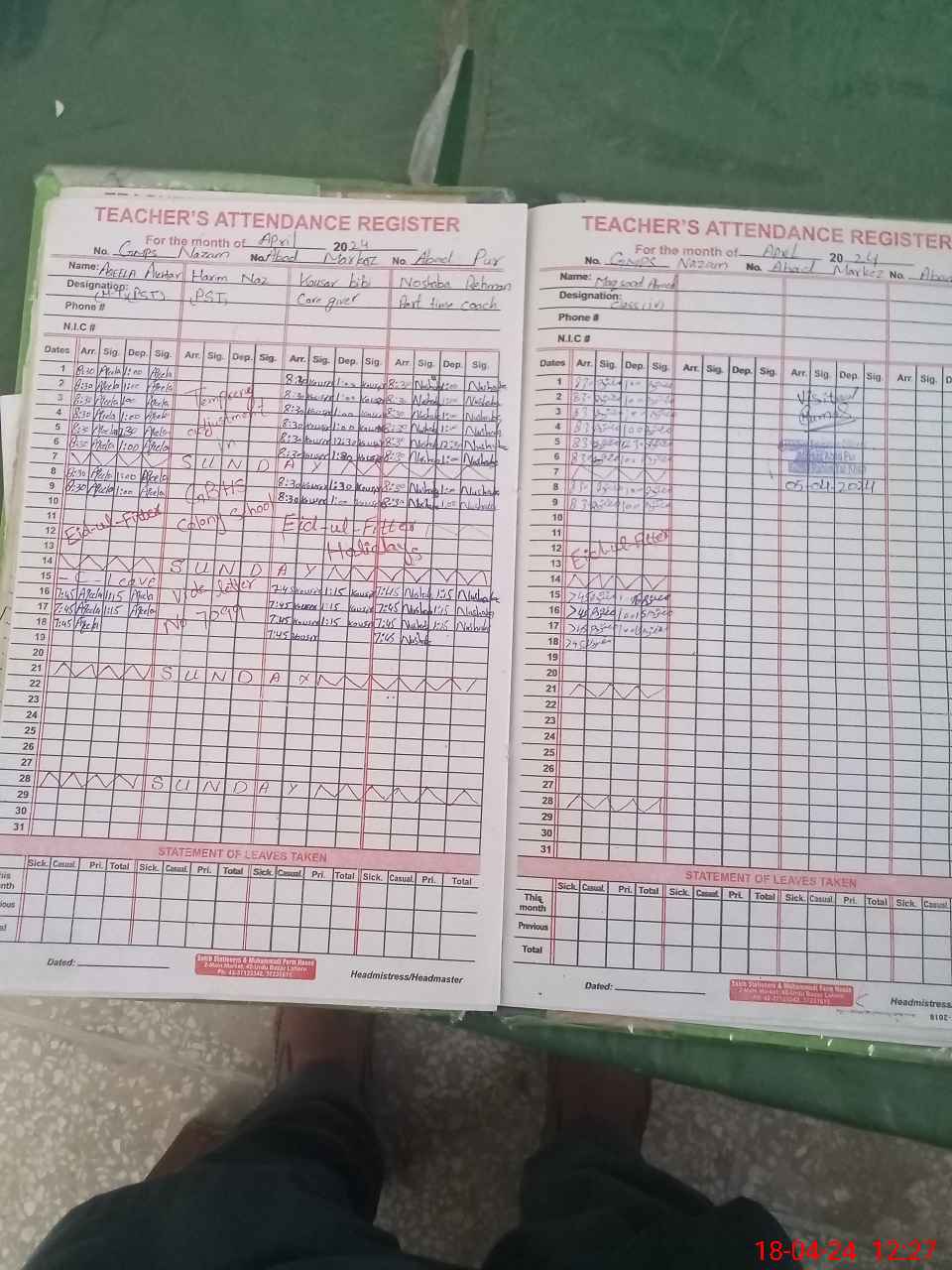 | Leave | Duty | Absent | Maternity | Medical | Ex- Pak |
