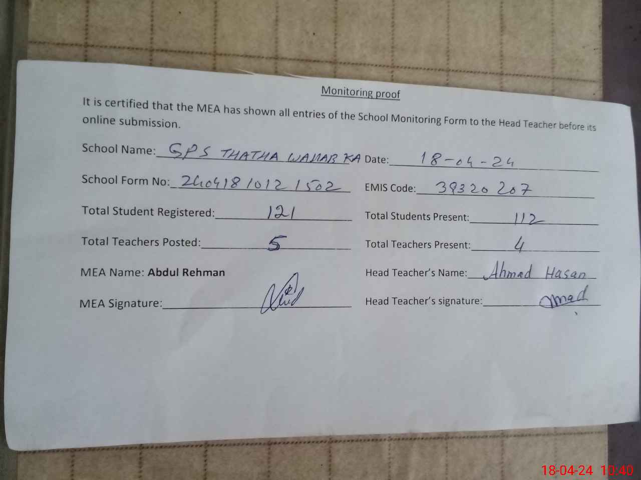 | EMIS Code: 39320207 | Name of School: GPS THATHA WAHAB KA | |||