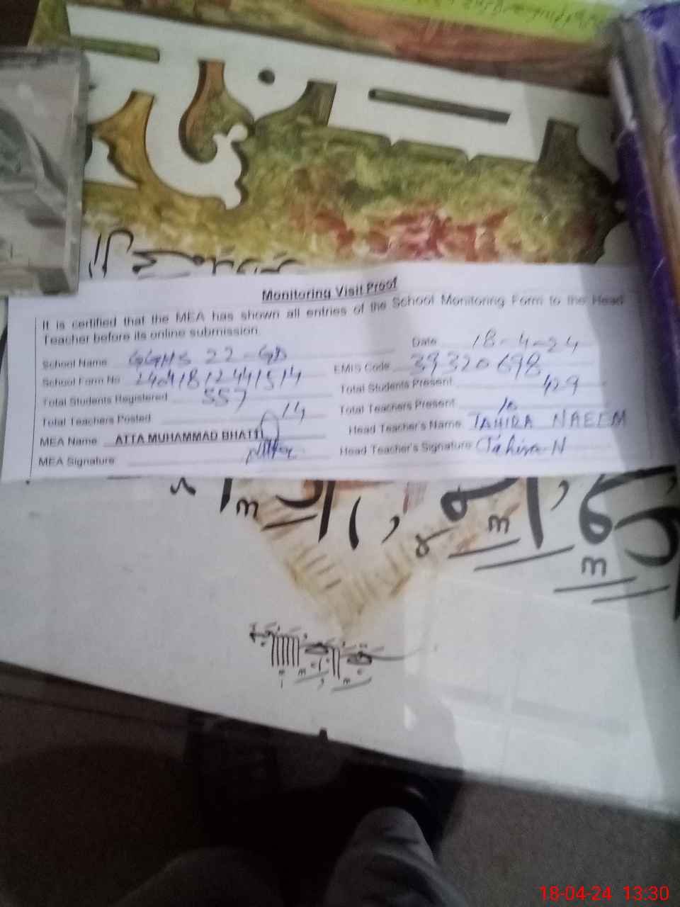 | Attendance Register | Head Teacher | MEA with School | Visit Proof |