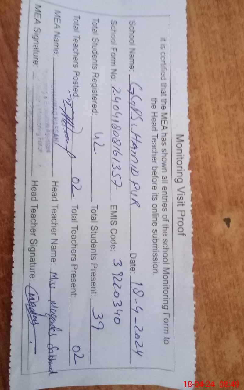 | EMIS Code: 39220340 | Name of School: GGPS HAMID PUR | |||