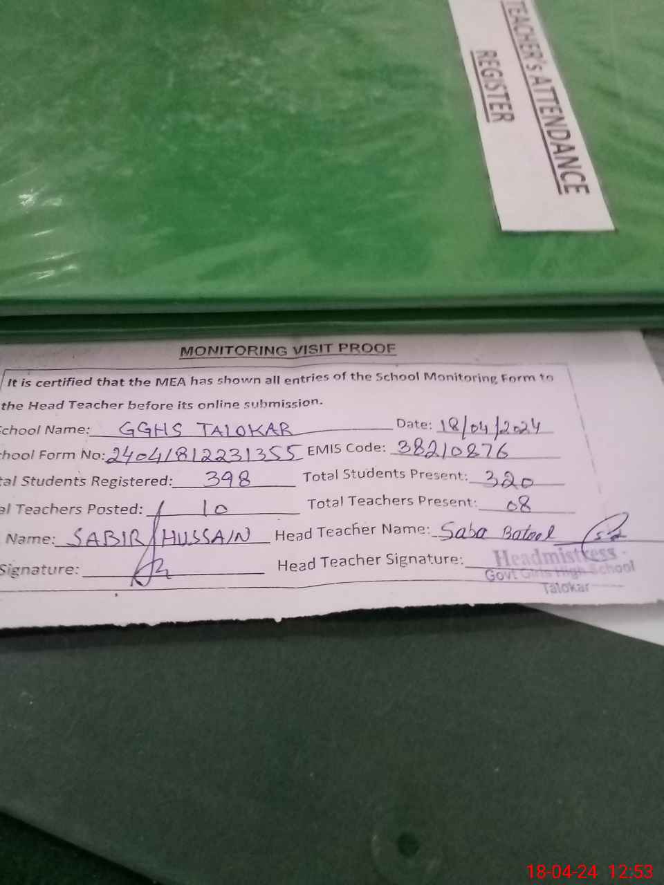 | EMIS Code: 38210876 | Name of School: GGHS TALOKAR | |||