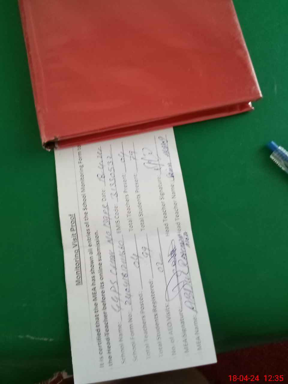 | Attendance Register | Head Teacher | MEA with School | Visit Proof |