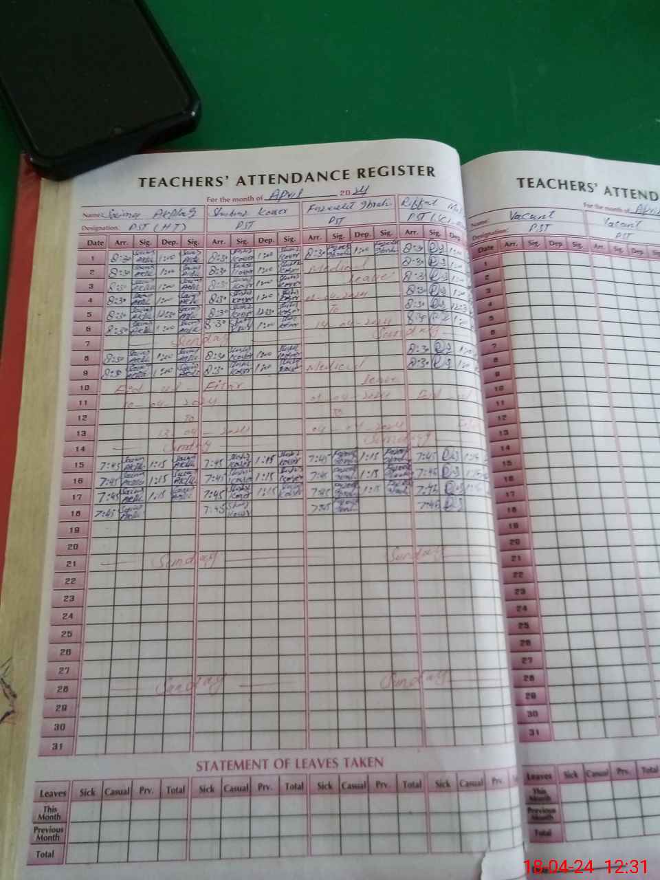 | Leave | Duty | Absent | Maternity | Medical | Ex- Pak |