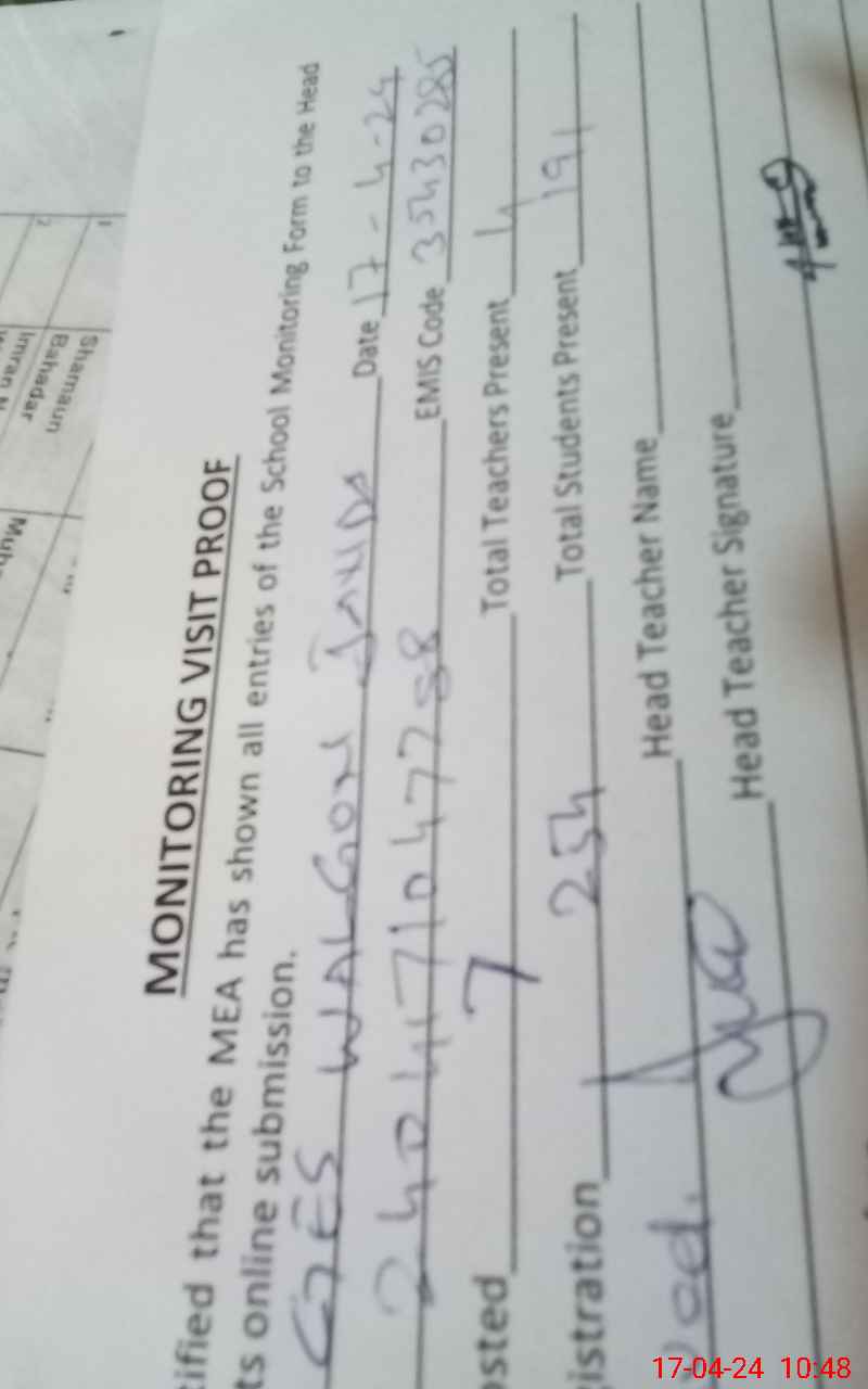 | Attendance Register | Head Teacher | MEA with School | Visit Proof |