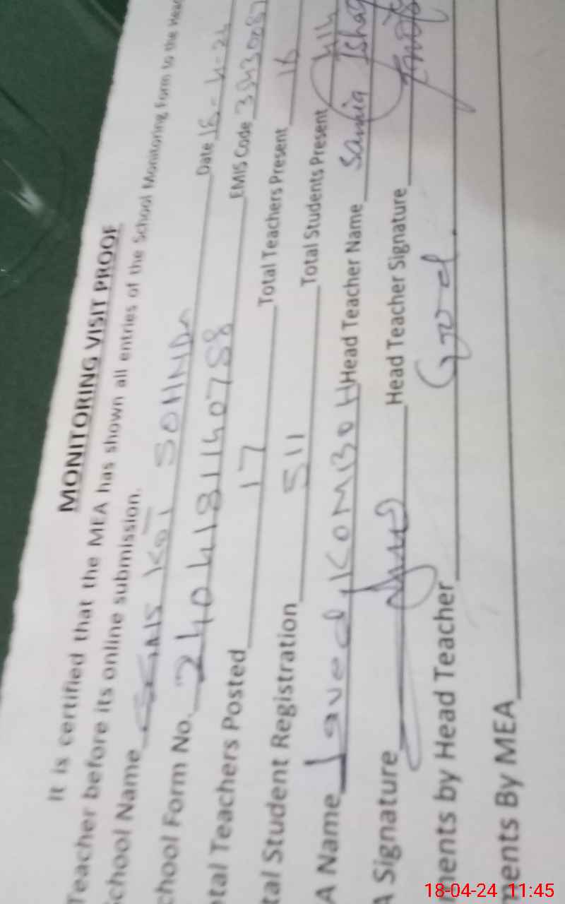 | Name: ZA**** NNI**** Designation: (School Headmaster's/Headmistress's) SST Phone/Cell Number: 03**** |