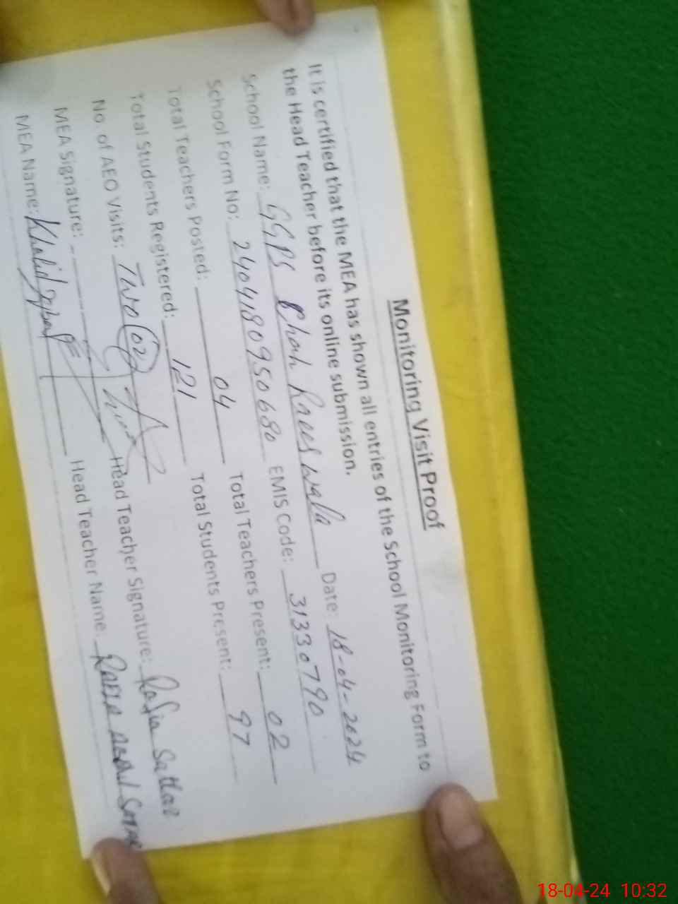 | Attendance Register | Head Teacher | MEA with School | Visit Proof |