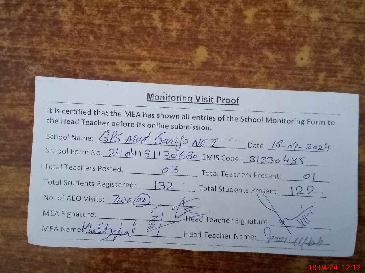 | EMIS Code: 31330435 | Name of School: GPS MUD GANGOO | |||