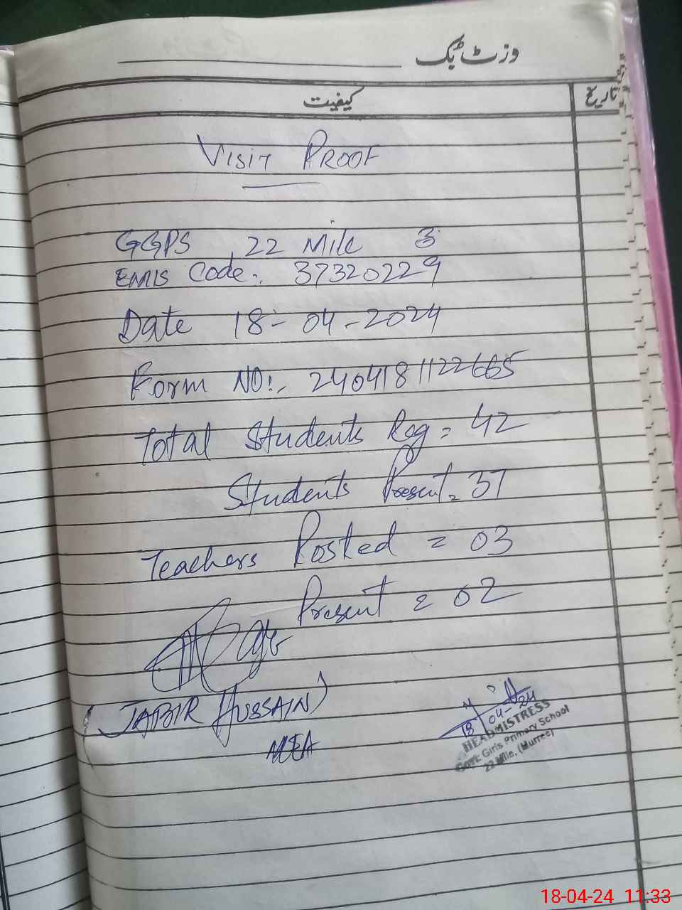 | Attendance Register | Head Teacher | MEA with School | Visit Proof |