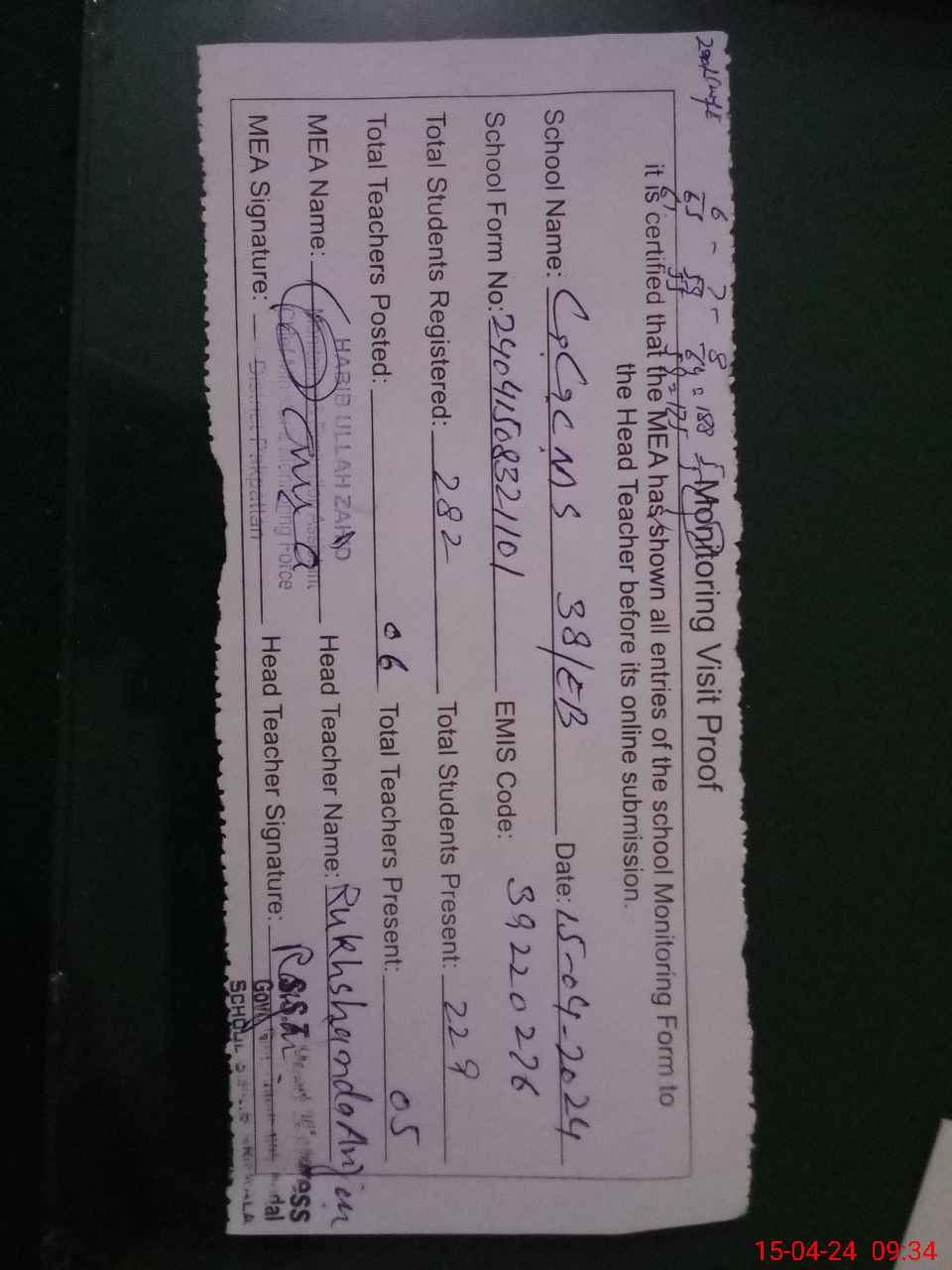 | Attendance Register | Head Teacher | MEA with School | Visit Proof |