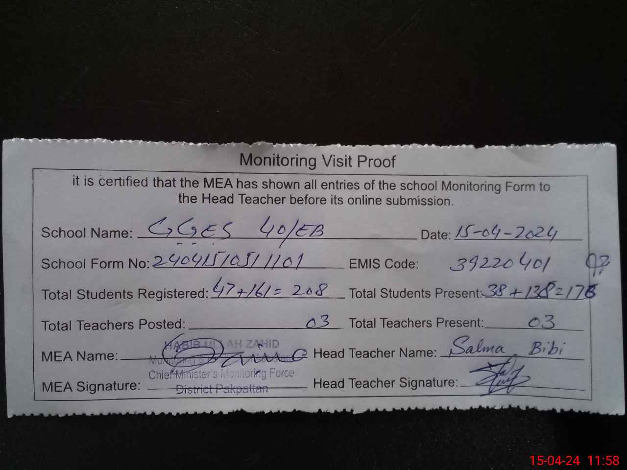 | EMIS Code: 39220401 | Name of School: GGES 40 EB PO 40 EB ARIF WALA | |||