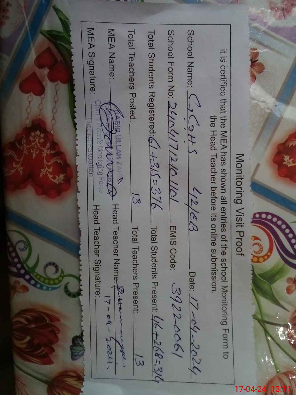 | Attendance Register | Head Teacher | MEA with School | Visit Proof |