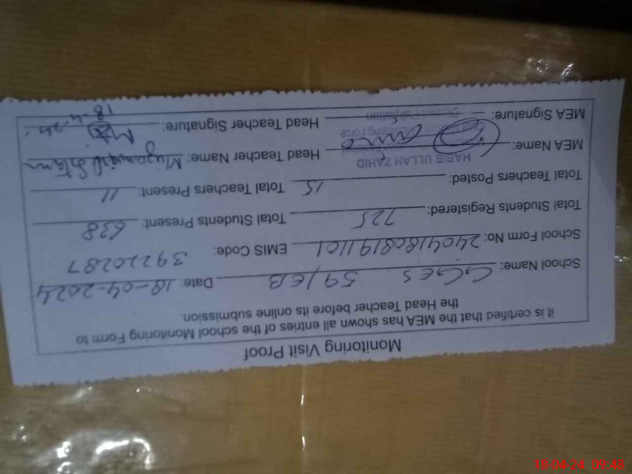| Attendance Register | Head Teacher | MEA with School | Visit Proof |