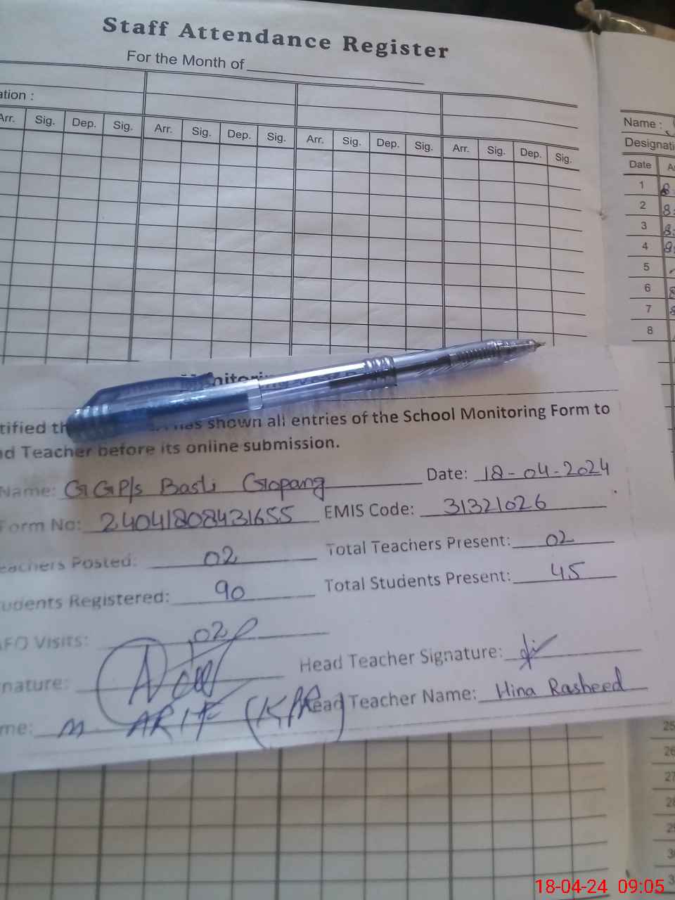 | Name: Ma**** Ha**** Kh**** Designation: (School Headmaster's/Headmistress's) PST Phone/Cell Number: 03**** |