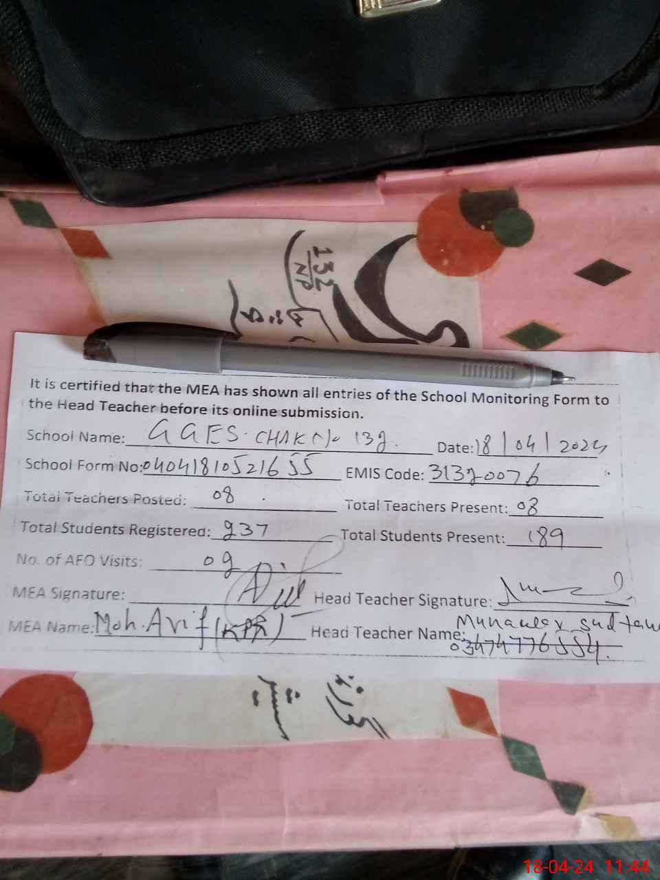 | Name: MU**** SU**** Designation: (School Headmaster's/Headmistress's) S.S.T.(G) Phone/Cell Number: 03**** |