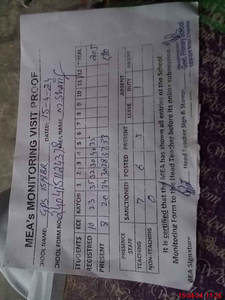 | Attendance Register | Head Teacher | MEA with School | Visit Proof |