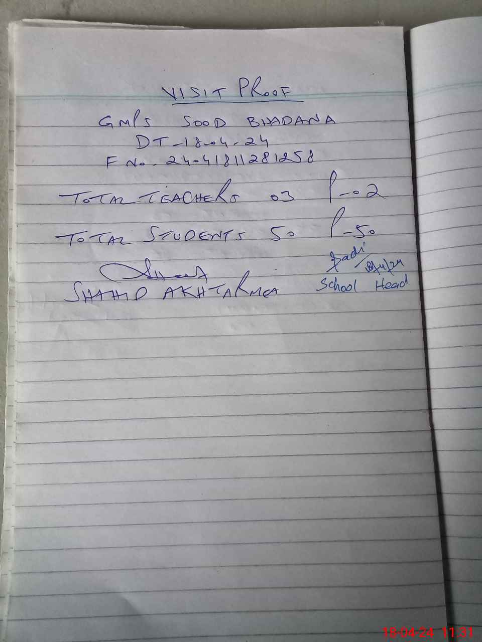 | Attendance Register | Head Teacher | MEA with School | Visit Proof |