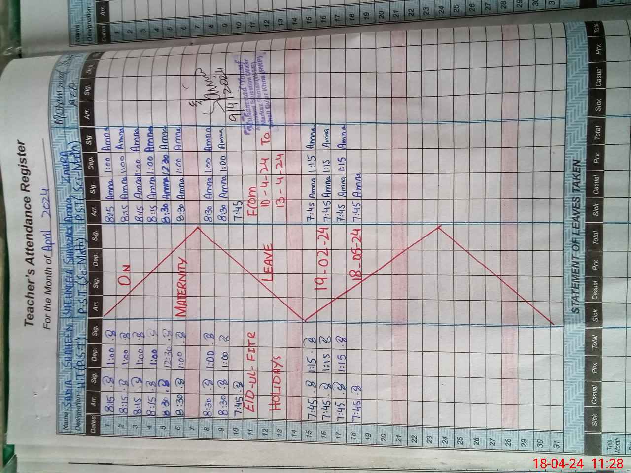 | Leave | Duty | Absent | Maternity | Medical | Ex- Pak |