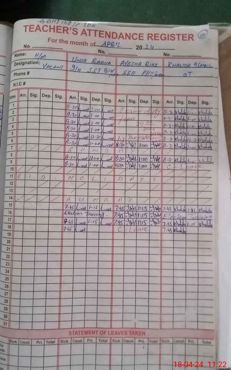 | CNIC | Full Name | Designation | R/C | Absence During Last Calender Month |