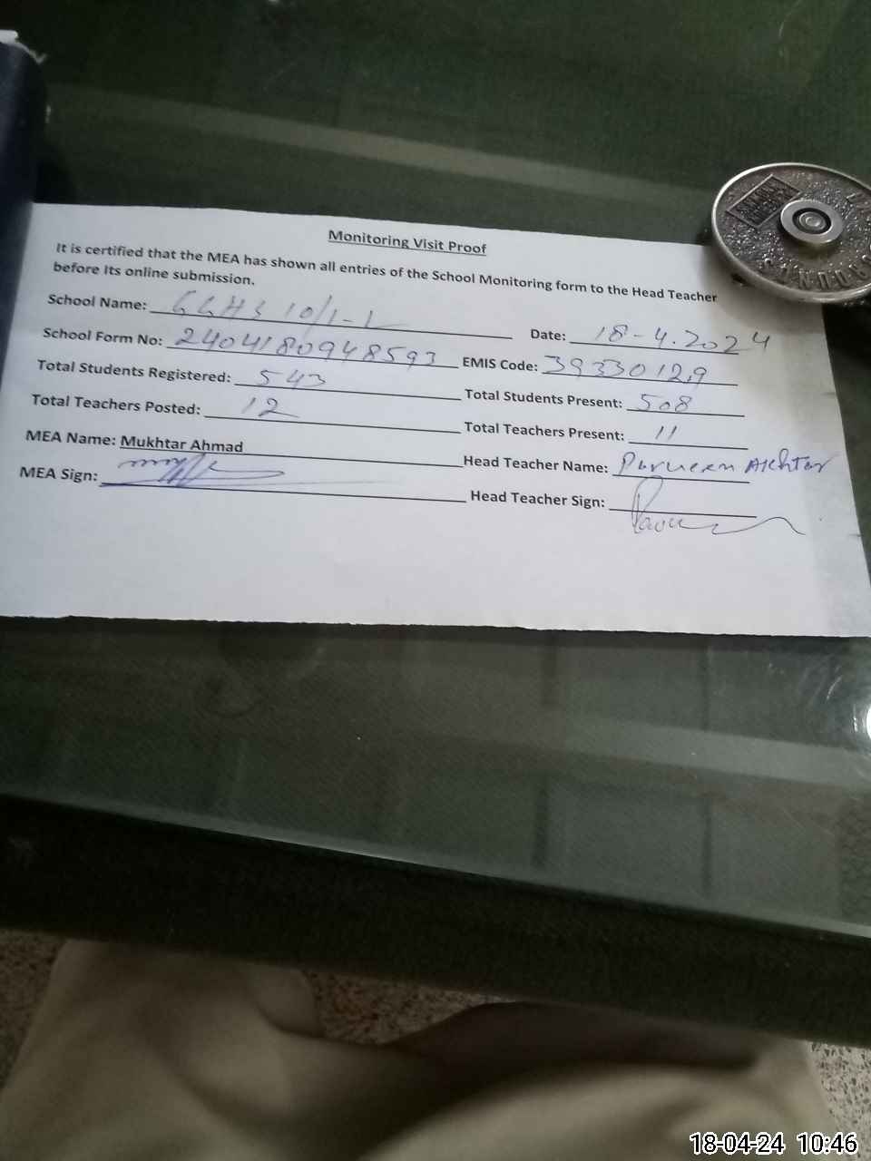 | Attendance Register | Head Teacher | MEA with School | Visit Proof |