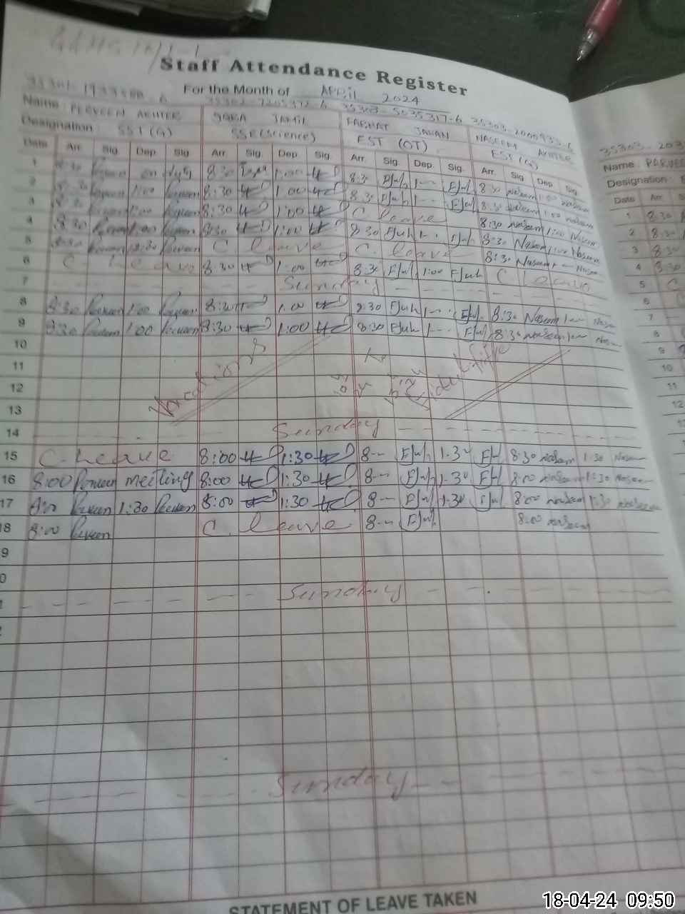 | Leave | Duty | Absent | Maternity | Medical | Ex- Pak |