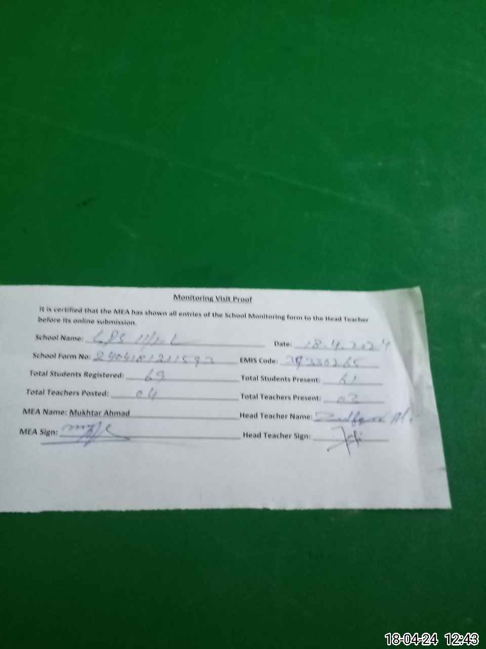 | Attendance Register | Head Teacher | MEA with School | Visit Proof |