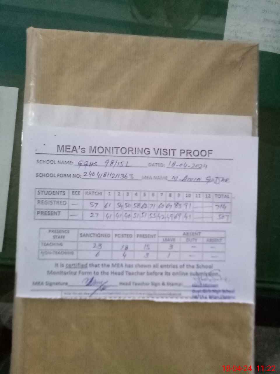 | Attendance Register | Head Teacher | MEA with School | Visit Proof |