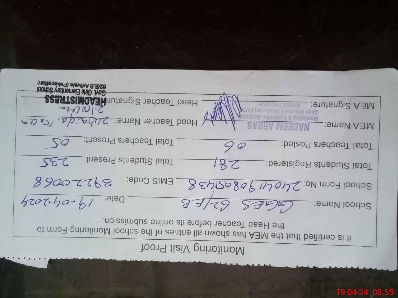| Name: MA**** IQ**** Designation: (School Headmaster's/Headmistress's) EST Phone/Cell Number: 03**** |