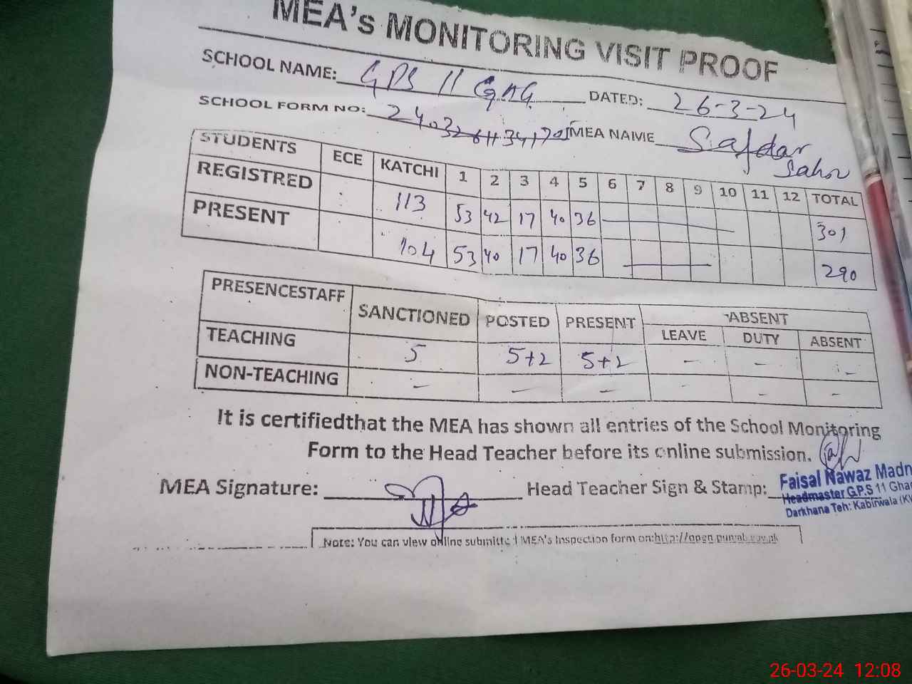 | Attendance Register | Head Teacher | MEA with School | Visit Proof |