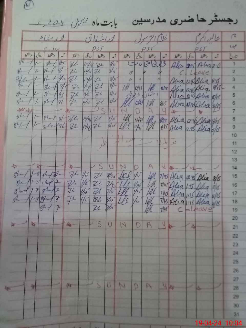 | CNIC | Full Name | Designation | R/C | Absence During Last Calender Month |