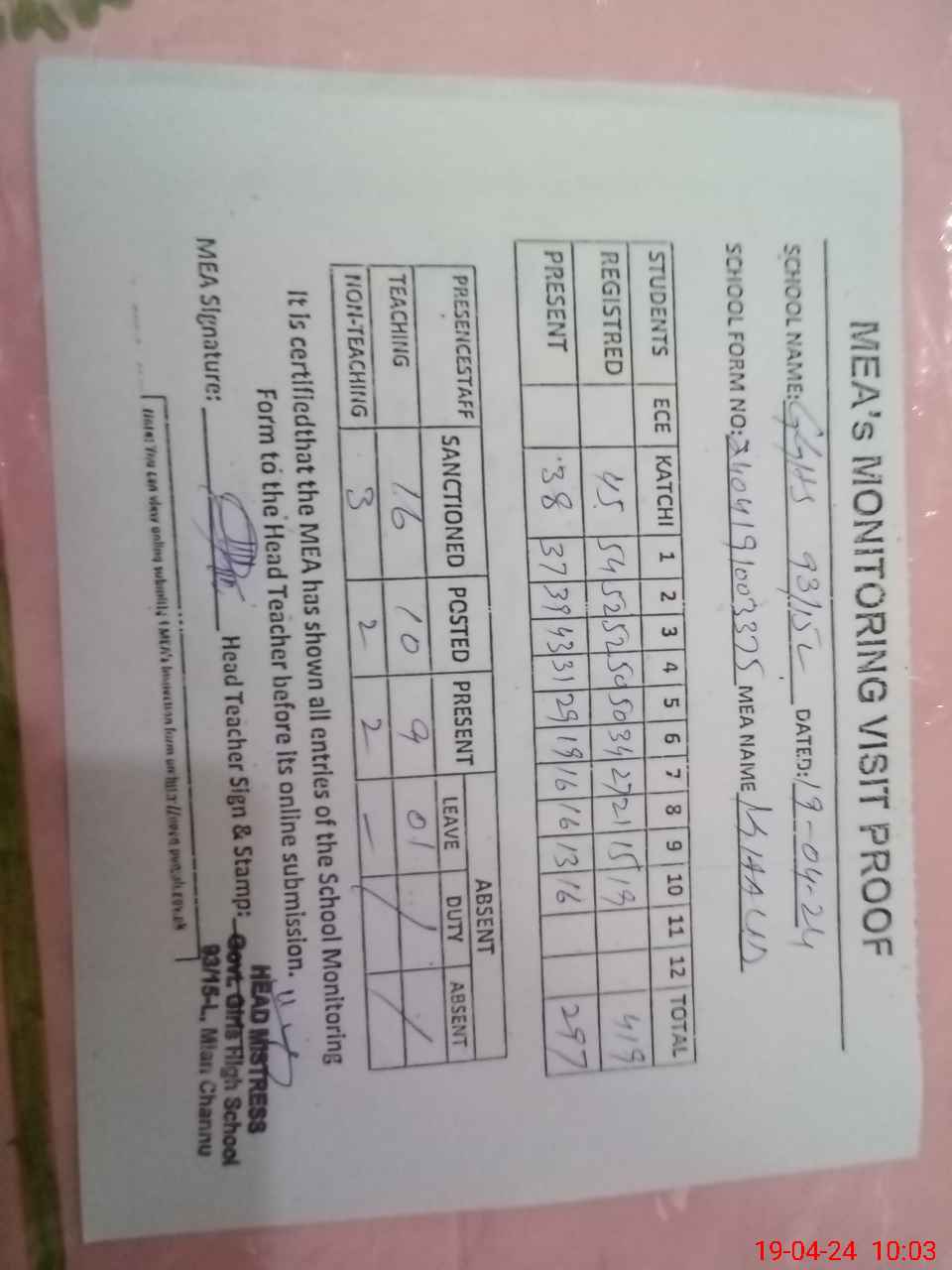 | Attendance Register | Head Teacher | MEA with School | Visit Proof |