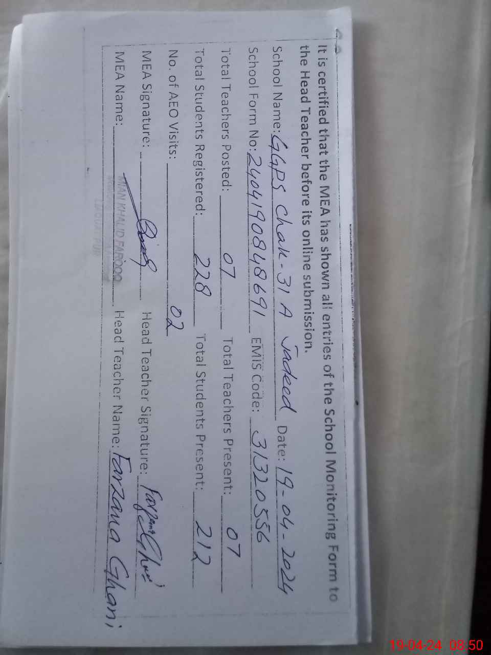 | Certified that this School was Inspected by the Undersigned MEA/DMO Today and the Information Stated Above is as Per Record. | |||||