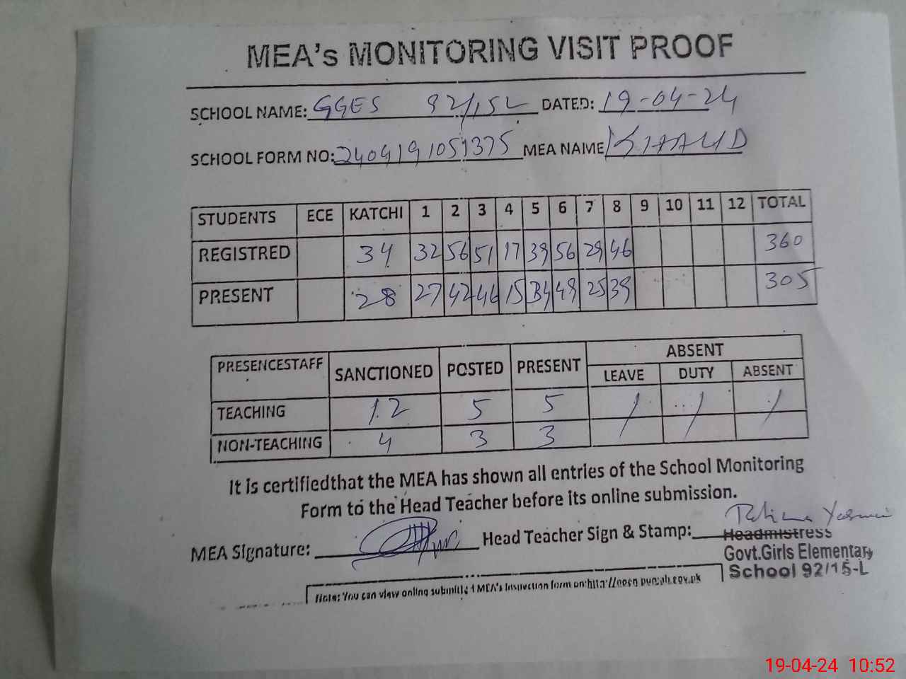 | Attendance Register | Head Teacher | MEA with School | Visit Proof |