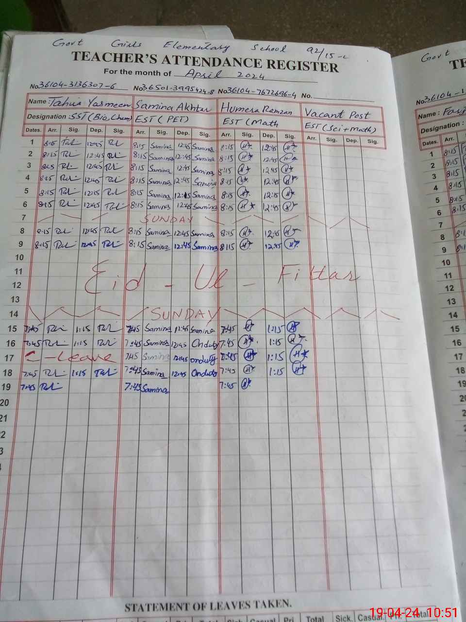 | Leave | Duty | Absent | Maternity | Medical | Ex- Pak |